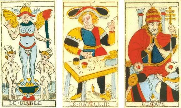 Lettura di tre carte: Il Diavolo, Il Bagatto, Il Papa